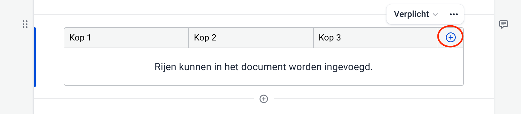 Door op het + icoon te drukken kan er een nieuwe kolom worden toegevoegd en de kop worden ingevuld. Ook kan er boven de tabel gekozen worden of de tabel verplicht in te vullen is of optioneel. Als je op de 3 puntjes "..." klikt, heb je ook de mogelijkheid om een hulpbeschrijving toe te voegen voor de documentschrijver.