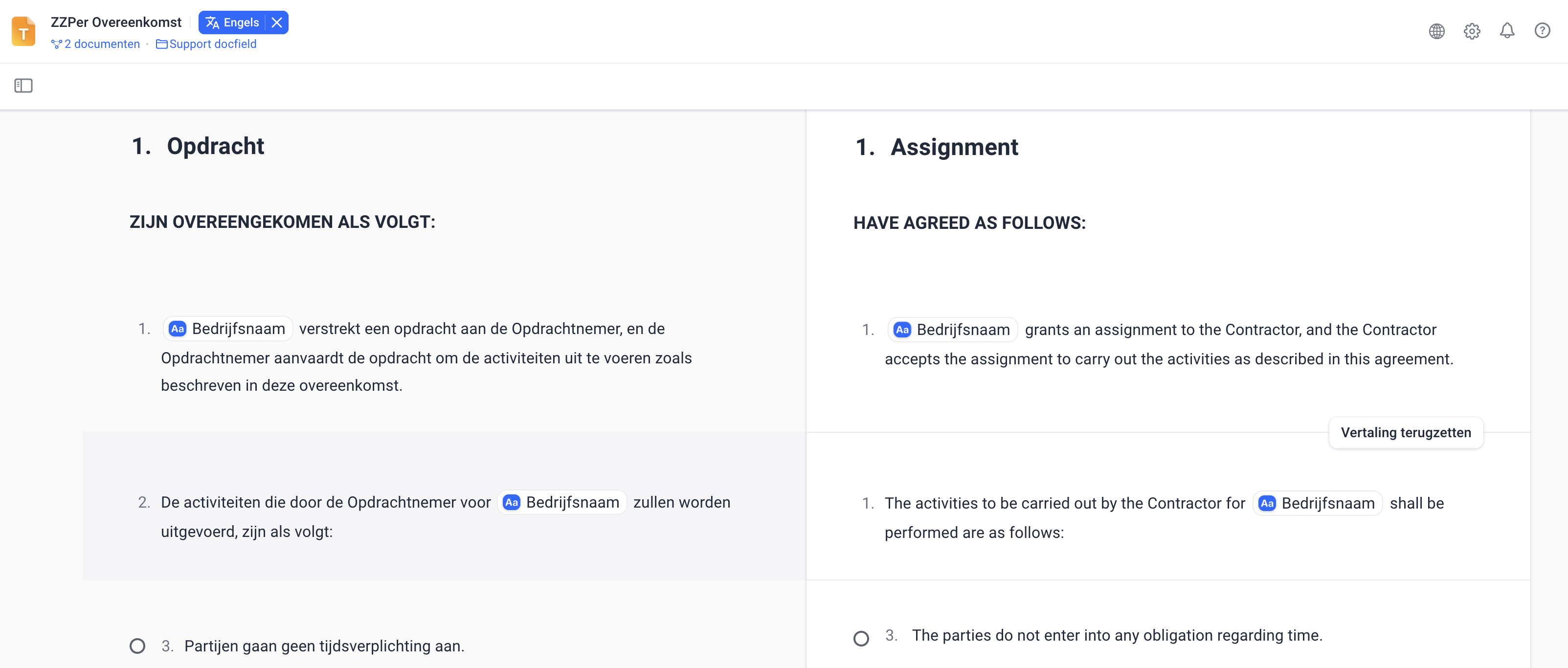 Met de functie Meertalige templates beheer je één template in meerdere talen. Dit maakt het makkelijker om documenten in verschillende talen te maken en te onderhouden. In de editor zie je per blok de originele tekst naast het vertaalveld. Met de knop Vertalen kun je de tekst automatisch laten vertalen. Zo blijft alles overzichtelijk en hoef je geen aparte templates meer te gebruiken.