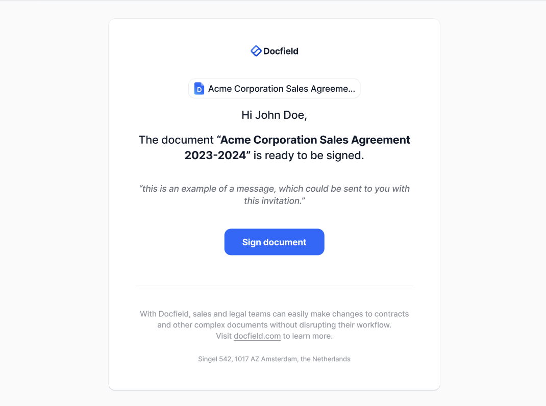 Als de persoon die uitgenodigd is om te ondertekenen de mail heeft geopend; of ingelogd is in Docfield en het document geopend heeft kan de persoon direct in het document ondertekenen. Ondertekenen kan eenvoudig door een handtekening te zetten of je naam te typen en vervolgens op 'Accepteer en onderteken' te drukken.